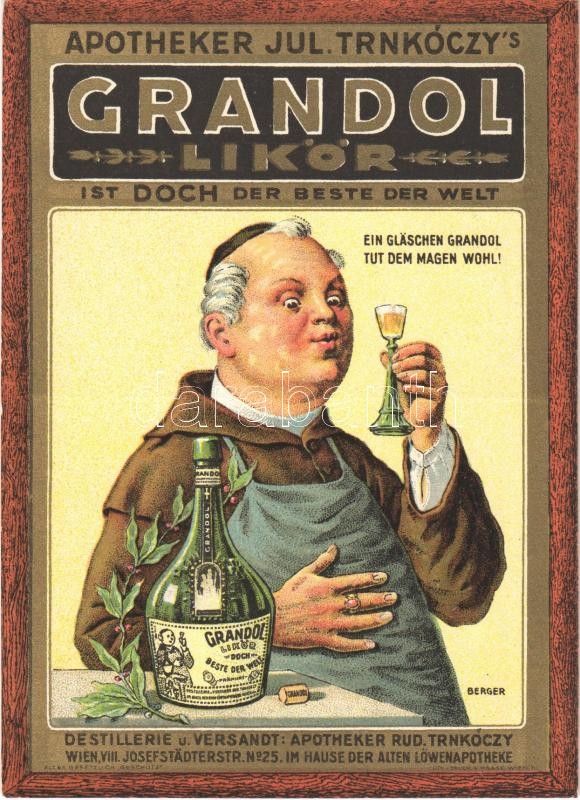 Apotheker Jul. Trnkóczy's Grandol Likőr. Destillerie u. Versandt Apotheker Rud. Trnkóczy. Wien VIII. Josefstädterstr. No. 25. / Austrian pharmacist's advertisement card, appetizing liqueur, litho s: Berger