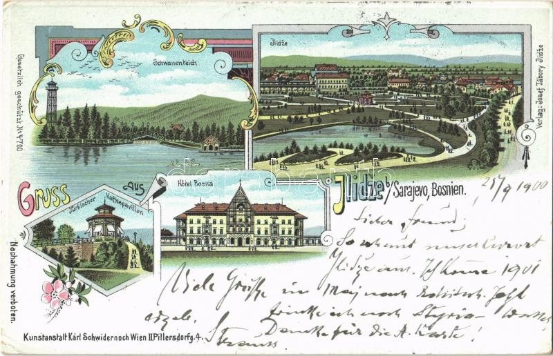 Description: 1900 Ilidza, Ilidze b. Sarajevo; Hotel Bosna, Schwanenteich, Türkischer Kaffeepavillon / hotel, lake, Turkish cafe shop. Kunstanstalt Karl Schwidernoch Art Nouveau, floral, litho (EK)