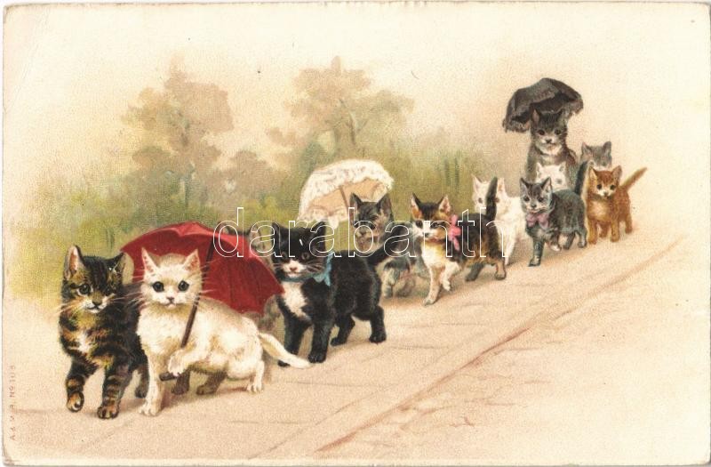 Cats with umbrellas. A. & M. B. No. 108. litho (EK)