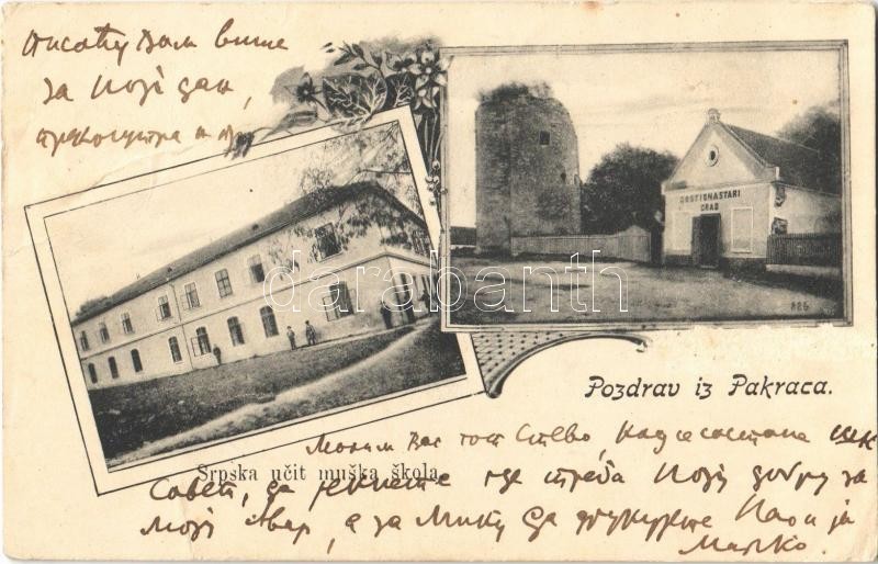 Description: 1903 Pakrác, Pakratz, Pakrac; Srpska ucit muska skola, Gostionastari Grad / Szerb fiúiskola, Régi vár fogadó, vendéglő, étterem / Serbian boys school, old castle inn, restaurant (gyűrődés / crease)