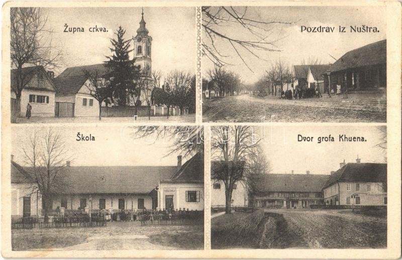 1910 Berzétemonostor, Nustar; Zupna crkva, Skola, Fvor grofa Khuena / Plébániatemplom, Iskola, Fő utca, üzlet, Khuen kastély / parish church, school, main street, shop, castle. A. Gomercic fotograf (EK)