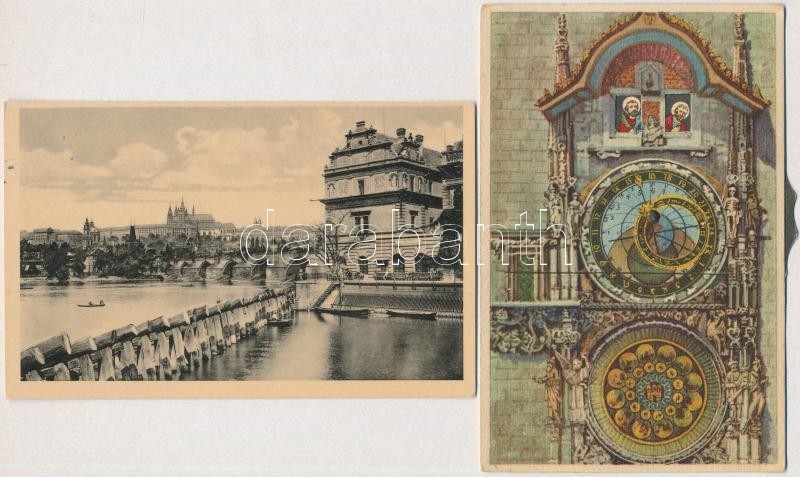 Description: Praha, Prag, Prága, Prague; - 2 db régi városképes lap, közte egy mechanikus forgatható apostolokkal / 2 pre-1945 town-view postcards, including a mechanical card with apostles