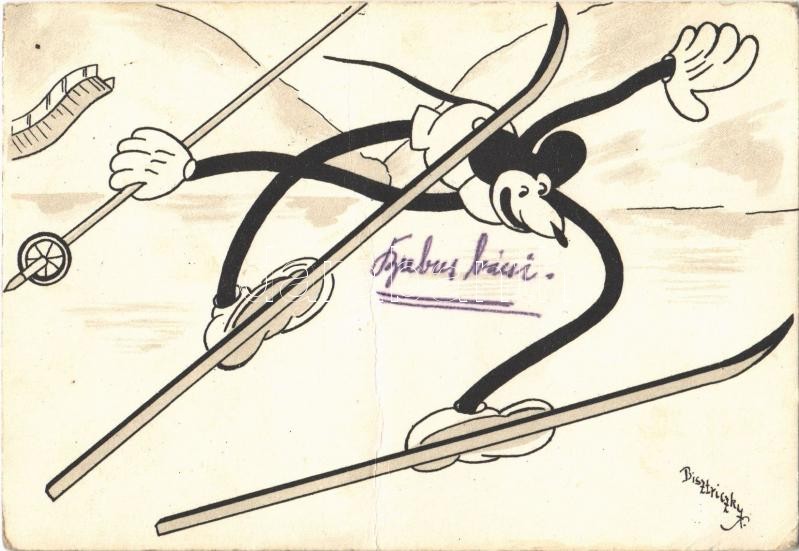 1938 Mickey Mouse skiing. Klösz early Disney art postcard s: Bisztricz...