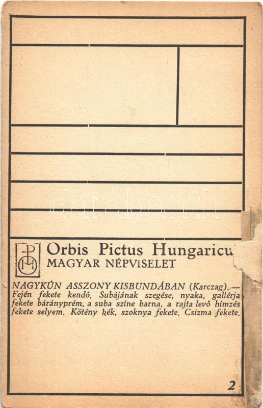 Nagykun asszony kisbundában (Karcag), Magyar Népviselet, Orbis Pictus ... https://www.darabanth.com/en/361-Online-auction/361.0/Postcards/Folklore~1500044/Nagykun-asszony-kisbundaban-Karcag-Magyar-Nepviselet-Orbis-Pictus-Hungaricus-old-Hungarian-l~II2079549