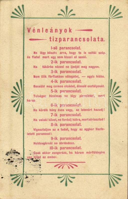 https://www.darabanth.com/en/361-Online-auction/361.0/Postcards/Humour~1500056/1901-Venleanyok-tizparancsolata-Humoros-lap-Ten-Commandments-of-old-maids-humour~II2057142