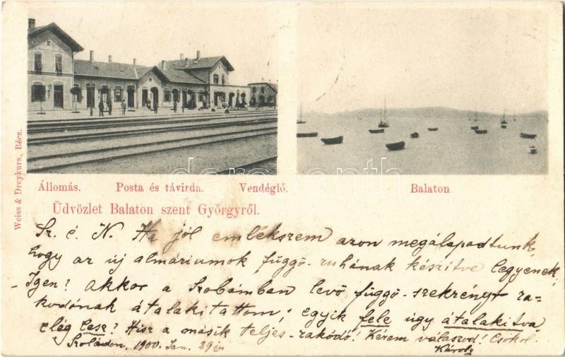 1900 Balatonszentgyörgy, Vasútállomás, Posta és távirda, Balaton, csónakok. Weisz és Dreykurs kiadása