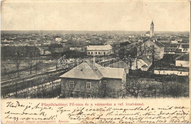 1901 Püspökladány, Fő utca és a városrész a református imaházzal. Fénynomat Divald műintézetéből (EK)