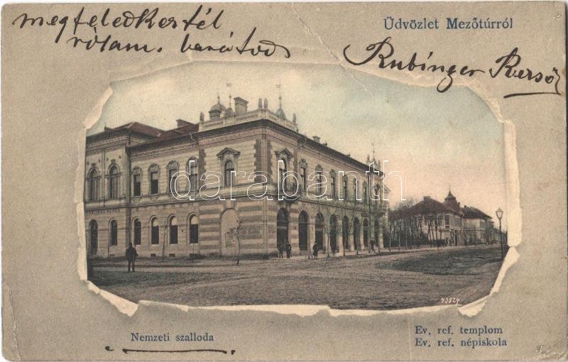 1904 Mezőtúr, Nemzeti szálloda, sörcsarnok, étterem és pálinkamérés, Református templom és népiskola. Art Nouveau (EK)