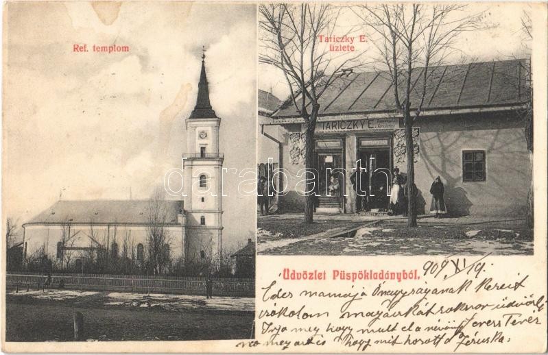 1909 Püspökladány, Református templom, Tariczky E. üzlete és saját kia...
