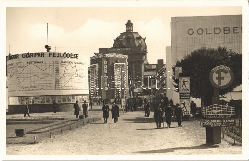 Description: 1935 Budapest, Nemzetközi Vásár, Magyar Gyáripar fejlődése, Pécsi Koksz, Magyar Királyi Dohányjövedék, Darling, Fenyves Áruház, Goldberger Gyár, Pé-Es harisnya + Érdekes bérmentesítés