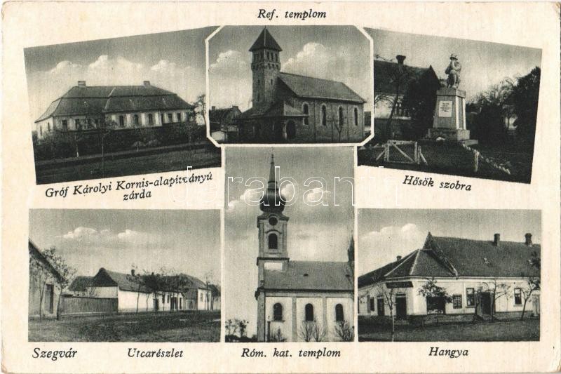 Description: 1949 Szegvár, Gróf Károlyi Kornis alapítványi zárda, Református templom, Hősök szobra, emlékmű, utca, Római katolikus templom, Hangya Szövetkezet üzlete (EK)