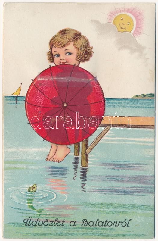 Balaton, Üdvözlet a Balatonról! napernyős leporellólap, benne balatoni...