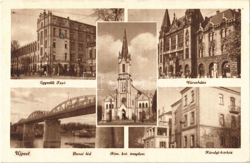 Budapest IV. Újpest, Egyesült Izzó, Városháza, Dunai híd, Római katolikus templom, Károlyi kórház