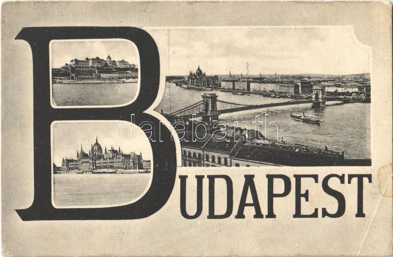 Budapest, Lánchíd, Országház, Parlament, Királyi vár. Szecessziós iniciálés montázslap (EB)