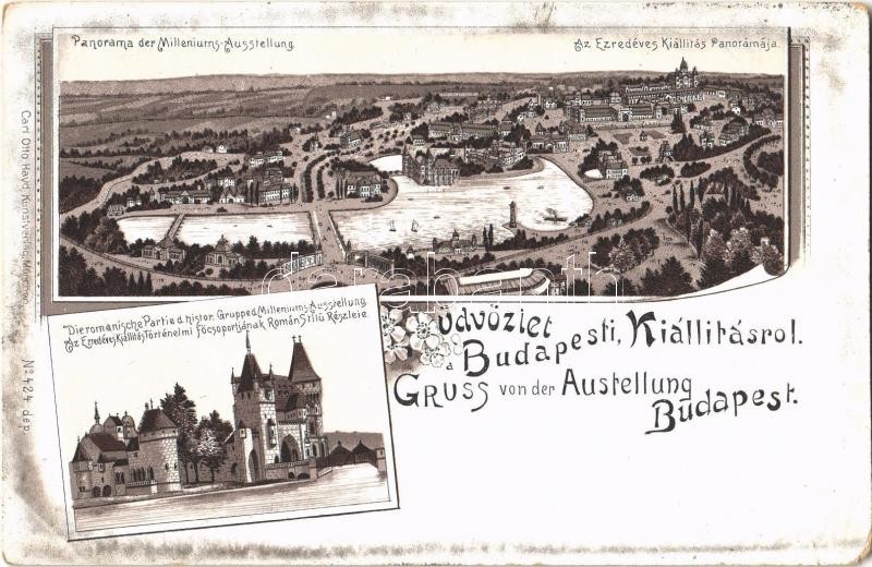 Description: Budapest XIV. Városliget, Az Ezredéves Kiállítás panorámája, a Történelmi Főcsoport román stílusú részlete, Vajdahunyad vára. Carl Otto Hayd Kunstverlag. No. 424. Art Nouveau floral litho (kopott sarok / worn corner)