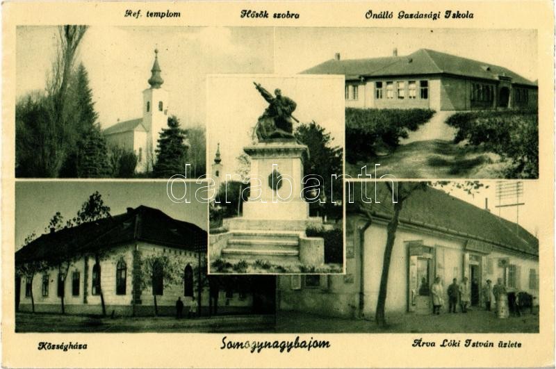 Nagybajom, Somogy-Nagybajom; Református templom, Hősök szobra, emlékmű, Önálló Gazdasági Iskola, Községháza, Árva Lóki István üzlete és saját kiadása
