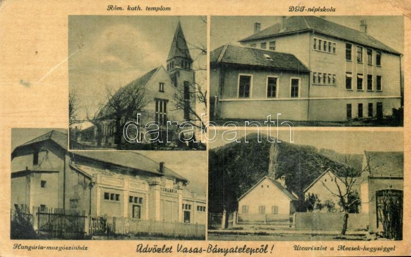 Pécs, Vasas bányatelep, Római katolikus templom, DGT (Dunagőzhajózási Társaság) népiskola, Hungária mozgószínház, mozi, utcakép a Mecsekkel (EK)