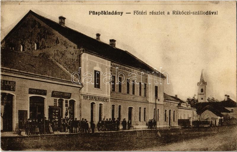 Püspökladány, Fő tér, Rákóczi vendéglő, kávéház és szálloda, Bor, sör és pálinkamérés, Péterfi Árpád és Kohn Aladár üzlete