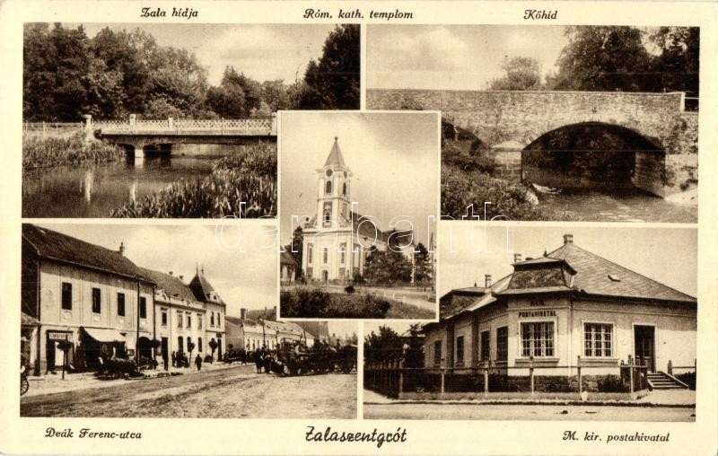 Zalaszentgrót, Zala hídja, Római katolikus templom, Kőhíd, Deák Ferenc utca, üzletek, M. kir. posta hivatal