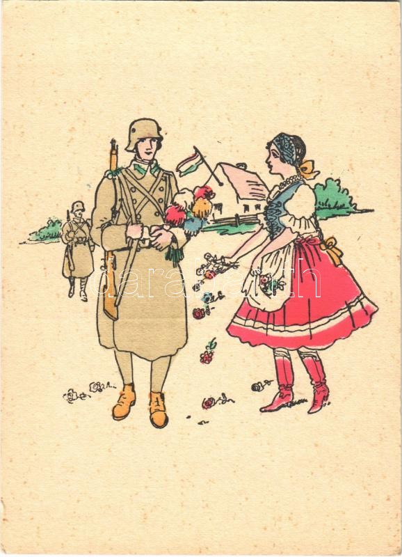 Description: Bevonuláskori művészlap katonával és honleánnyal. Kiadja a Defhe Aradi Temesi Bánság / WWII entry of the Hungarian troops, soldier and compatriot woman. Irredenta art postcard