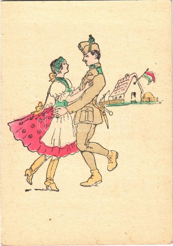 Description: Bevonuláskori művészlap katonával és honleánnyal. Kiadja a Defhe Aradi Temesi Bánság / WWII entry of the Hungarian troops, soldier and compatriot woman. Irredenta art postcard