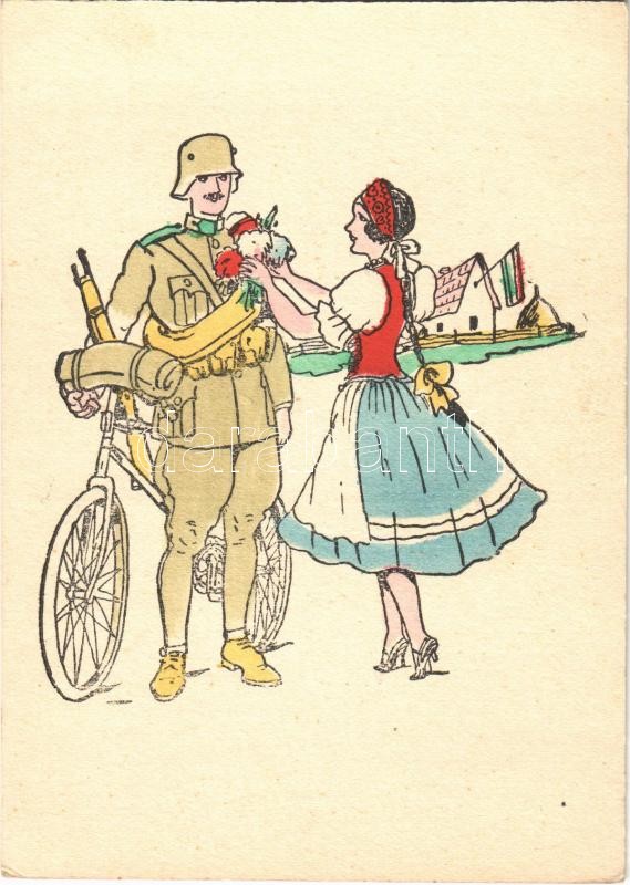 Description: Bevonuláskori művészlap kerékpáros katonával és honleánnyal. Kiadja a Defhe Aradi Temesi Bánság / WWII entry of the Hungarian troops, soldier and compatriot woman. Irredenta art postcard