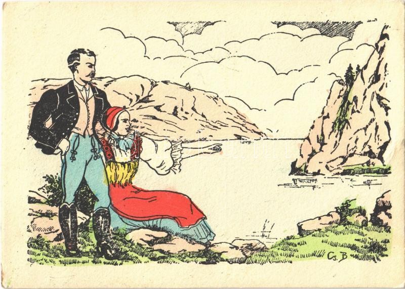 Description: Vaskapu-szoros, Portile de Fier, Derdapska klisura; Vaskapu a Dunán. Kiadja a Délvidéki Egyetemi és Főiskolai Hallgatók Egyesülete / "Iron Gates" of the Danube, traditional costumes, irredenta art postcard s: Cs. B. (EK)