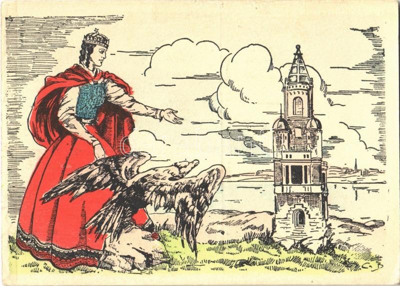 Description: Zimony, Semlin, Zemun; Ezredéves emlék. Kiadja a Délvidéki Egyetemi és Főiskolai Hallgatók Egyesülete / Millenium monument, traditional costumes, irredenta art postcard s: Cs. B. (EK)