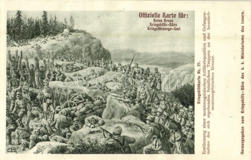 Kriegsbildkarte Nr. 21. Erstürmung einer montenegrinischen Artillerieposition und Gefangennahme der sich ergebenden feindlichen Truppen an der bosnisch-montenegrischen Grenze. Kriegshilfsbüro / WWI Austro-Hungarian K.u.K. military art postcard. Storming of a Montenegrin artillery position and capture of enemy troops on the Bosnian-Montenegrin border. artist signed