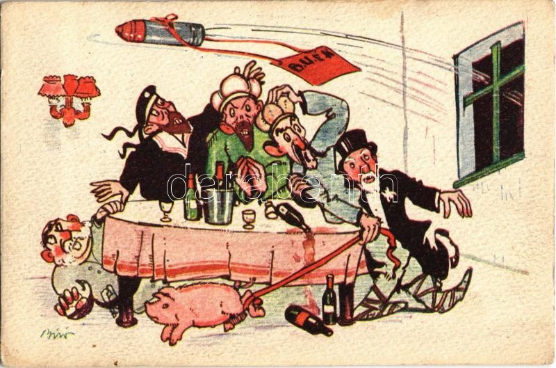 Description: Humoros első világháborús grafikai lap. A Központi hatalmak újévi estéje. Kiadja a Magyar Földrajzi Intézet Rt. / WWI Austro-Hungarian K.u.K. military propaganda. Central Powers celebrate New Year, while an explosive device flies through the window. Anti-Entente Powers mocking humorous art postcard s: Biró (EK)