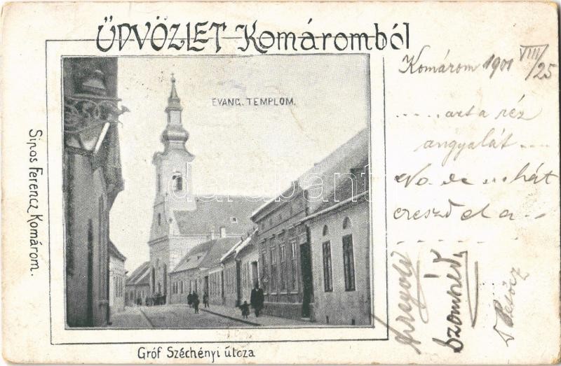 1901 Komárom, Komárno; Gróf Széchenyi utca, Evangélikus templom. Sipos Ferenc kiadása / street view, Lutheran church (EK)