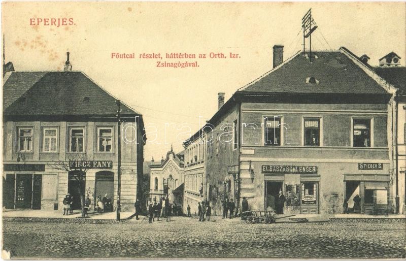 Eperjes, Presov; Fő utca, háttérben az orthodox izraelita zsinagóga, Stieber Z., Elsasz & Schlenger és Kircz Fany üzlete / main street, Orthodox synagogue, shops