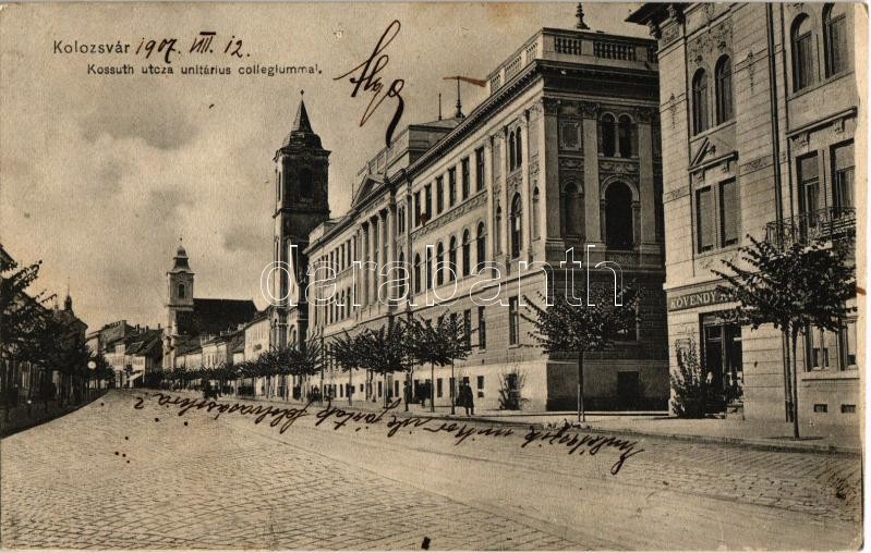 https://www.darabanth.com/en/361-Online-auction/361.0/Postcards/Transylvania~1500007/1907-Kolozsvar-Cluj-Kossuth-utca-unitarius-kollegium-Kovendy-uzlete-street-view-boarding-~II1954932