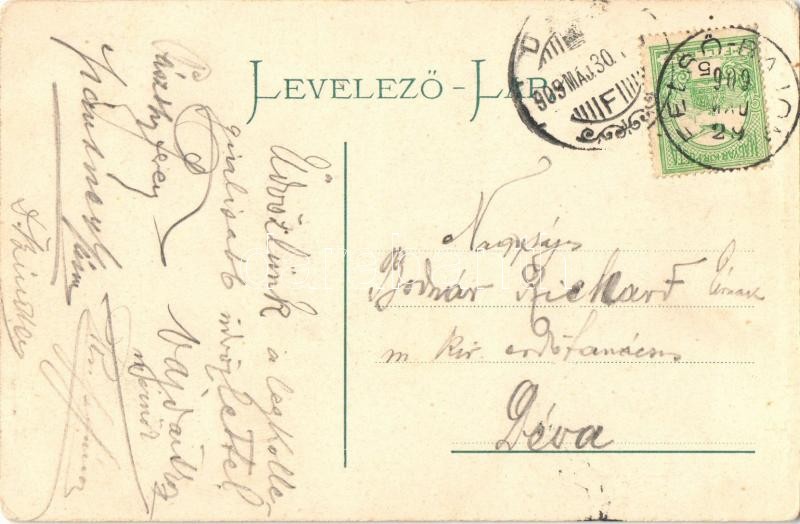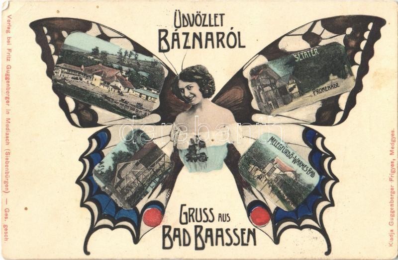 1909 Bázna, Bázna-fürdő, Felsőbajom, Baiumul de Sus, Baassen, Baile Bazna; Sétatér, meleg fürdő. Kiadja Guggenberger Frigyes. Szecessziós pillangós hölgy montázs művészlap / promenade, baths, spa. Art Nouveau butterfly lady montage art postcard (EK)