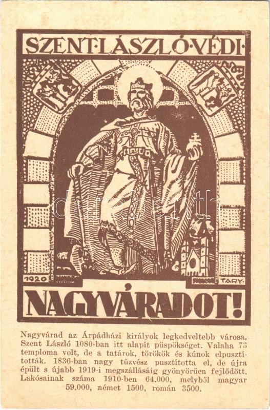 Nagyvárad, Oradea; Szent László védi Nagyváradot! / Ladislaus I of Hungary protects Oradea! Hungarian irredenta art postcard s: Tary