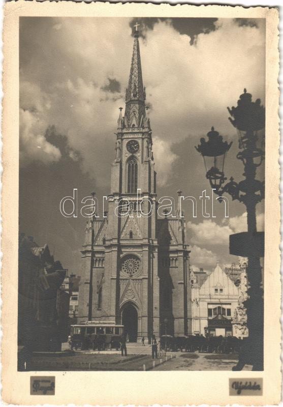 Description: 1941 Újvidék, Neusatz, Novi Sad; Római katolikus templom, Gyógyszertár, villamos / Catholic church, pharmacy, tram. Royal photo + "1941 Újvidék visszatért" So. Stpl. (EK)