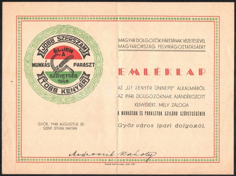 1948 Győr, Győr város ipari dolgozóinak emléklapja az új kenyér ünnepe... https://www.darabanth.com/en/362-Online-auction/362.0/Art-and-other-collectibles/Documents~500018/1948-Gyor-Gyor-varos-ipari-dolgozoinak-emleklapja-az-uj-kenyer-unnepe-alkalmabol-a-munka~II2089892