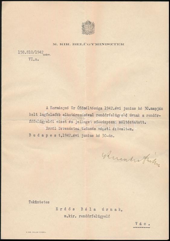 1942 Keresztes-Fischer Ferenc (1881-1948) belügyminiszter által saját kézzel aláírt rendőrfelügyelői kinevezés Erdős Béla (Vác) részére