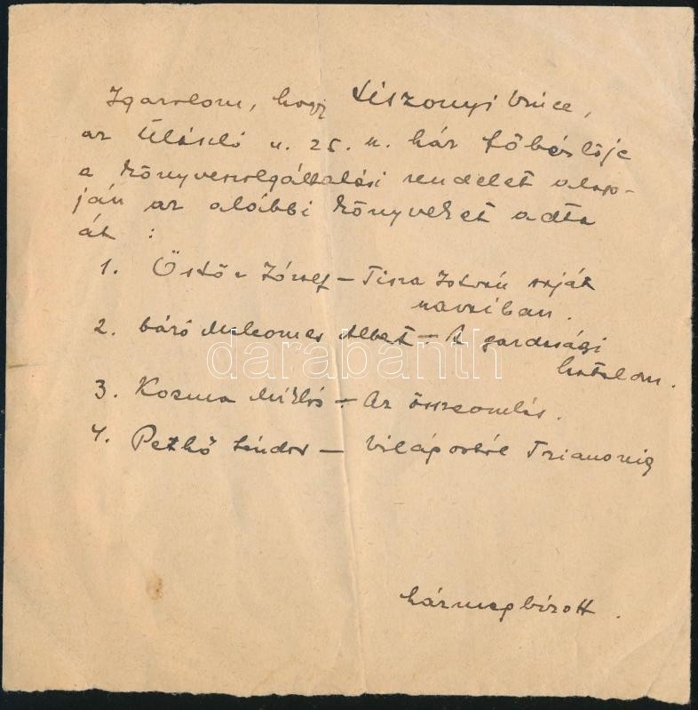 cca 1947 Házmegbízotti igazolás betiltott könyvek beszolgáltatásáról, részletes címlistával