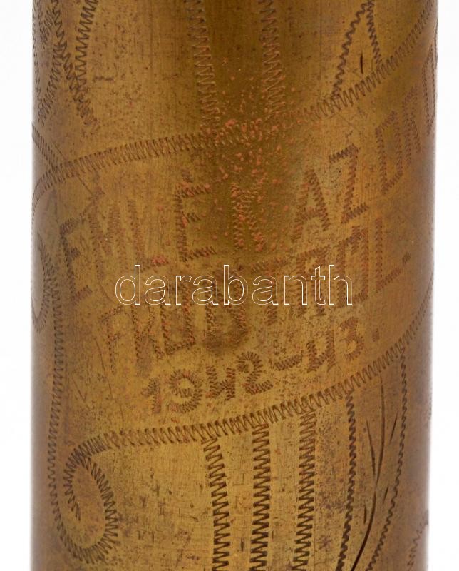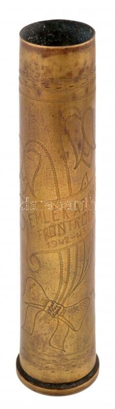 Ágyúhüvelyből készült emlék váza, réz, vésett, " emlék az orosz frontról 1942-43" felirattal, m: 26 cm /