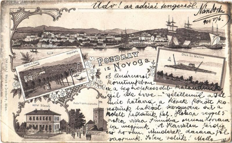 1904 Novi Vinodolski, Novoga; Hotel Lisanj, Kupaliste, Otok Sv. Marino, Hotel Slavulj, Kula Frankopanska / hotels, spa, island, tower. Art Nouveau, floral, litho (EK)