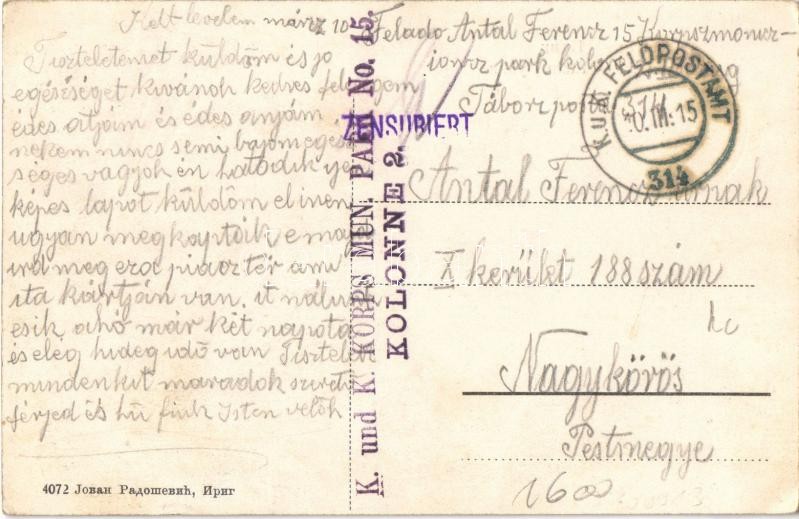 1915 Ürög, Irig; Glavna ulica / Fő utca, üzletek / main street, shops + "K. und K. KORPS MUN. PARK No. 15. KOLONNE 2." "K.u.K. FELDPOSTAMT 314" (EK)