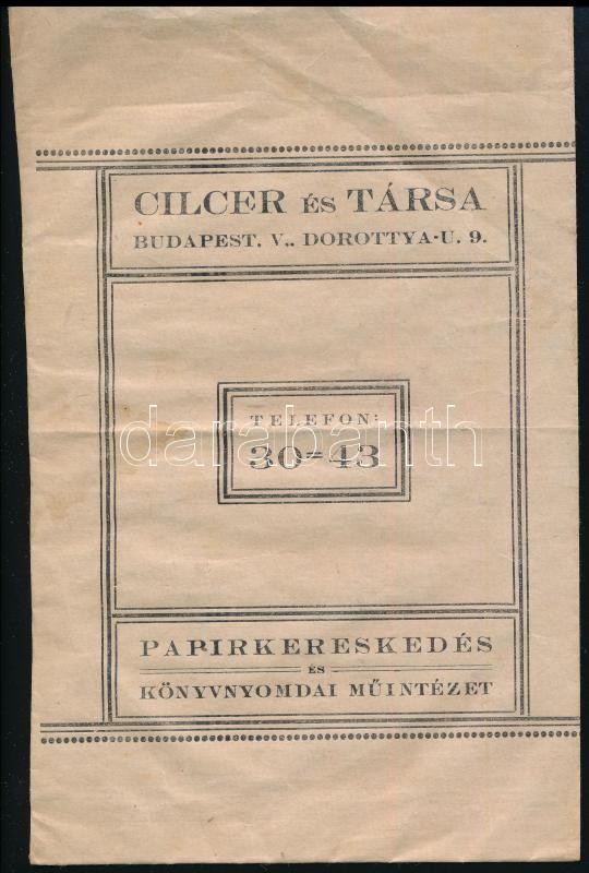 Bp.,Cilcer és Társa Papírkereskedés és Könyvnyomdai Műintézet papírtasakja.;