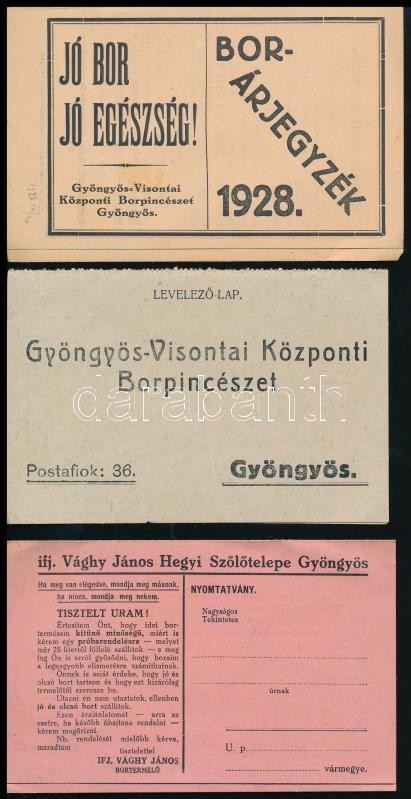 cca 1928 Gyöngyös-Visontai Központi Borpincészet 2 db nyomtatványa az egyik oldalon árjegyzékekkel, a másikon megrendelő levelezőlappal. + Gyöngyös, ifj Vághy János bortermelő nyomtatványa az egyik oldalon árjegyzékekkel, a másikon megrendelő levelezőlappal.