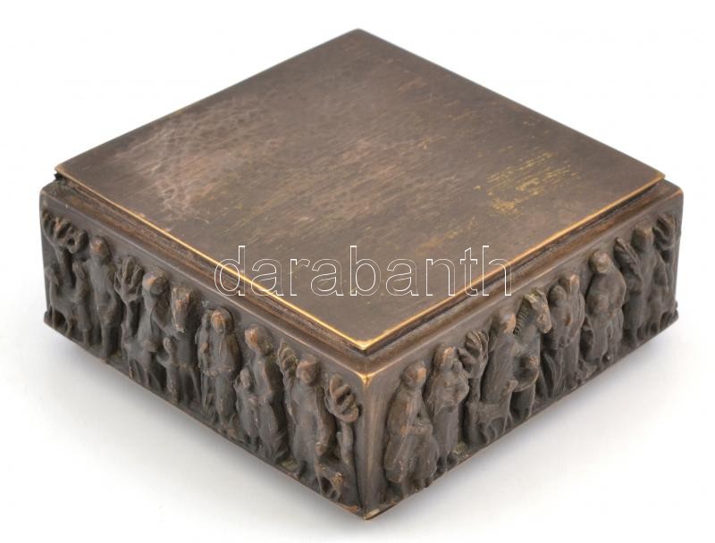 Tevan Margit (1901-1978: Ökörhajtók, fém dobozka, jelzett, karcolásokkal, 13×13×4,5 cm