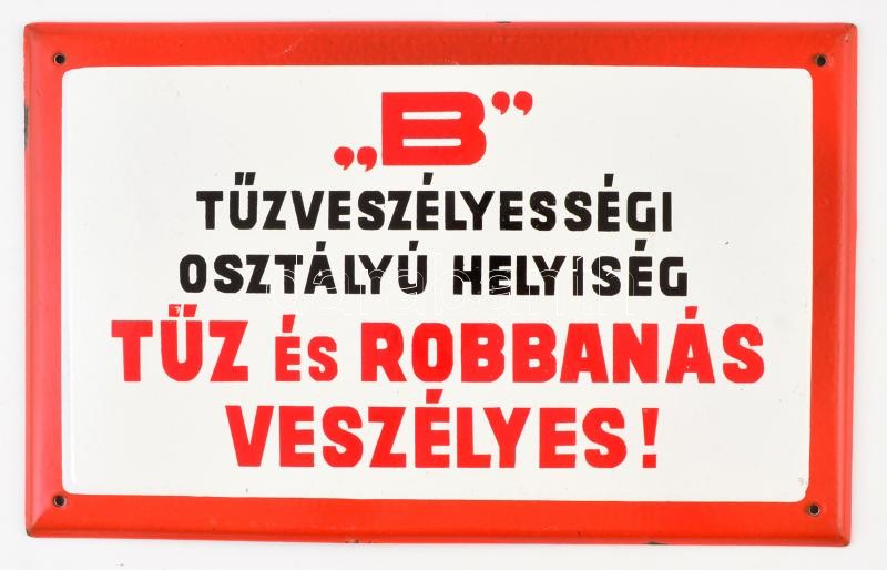 " "B" tűzveszélyességi osztályú helyiség, tűz- és robbanásveszélyes!", zománcozott fémtábla, 25×40 cm