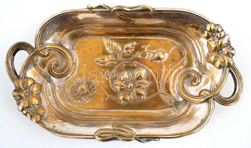 Szecessziós ezüstözött alpakka füles kínáló, jelzés nélkül, kopott, 37×21,5 cm