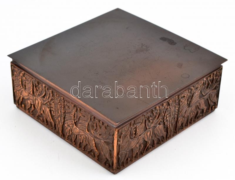 Vörösréz díszdoboz, fa betéttel, 15×15×6,5 cm