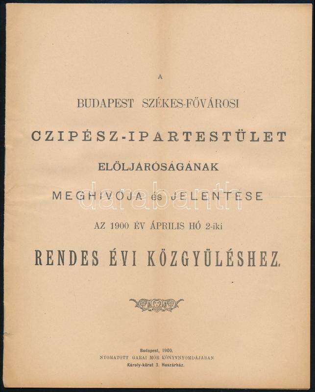 1900 Bp., A Budapest Székesfővárosi Cipész-ipartestület Elöljáróságának meghívója és jelentése a rendes évi közgyűléshez