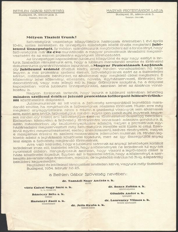 1934 Bethlen Gábor Szövetség körlevele a magyar Protestánsok Lapjának jubileumi számával kapcsolatban